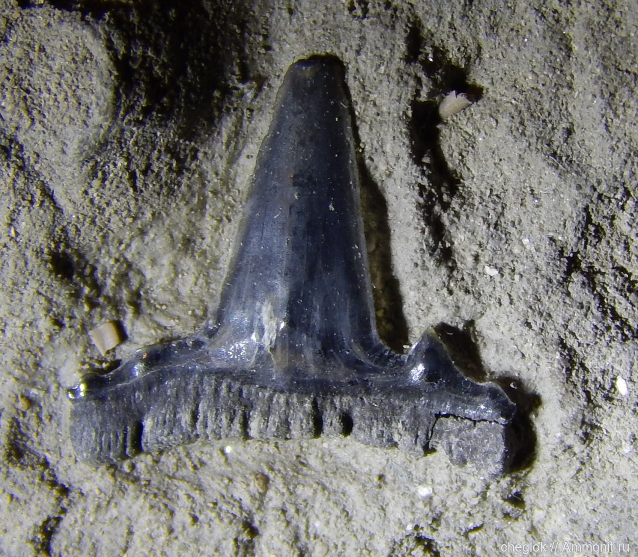 Ещё один из зубов, подаренных Андреем Ступаченко. Размер 16 мм, на типичного сфенодуса щуровски не похож, боковые зубцы шире..