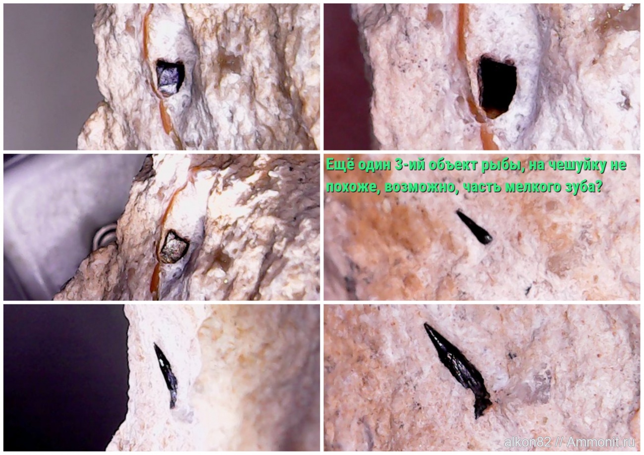 Фотографируя мшанку и её структуру под микроскопом, углядел что-то чёрное под брахиоподой, начал чистить, очистил, подумал "похоже на чешую, но может быть и что-то из геологии?" а потом ещё углядел рядом еле заметную точку чёрную, начал ковырять и чистить - оказался зуб, но зуб ранее такой не встречал, то что не палеониск это точно, совершенно не похож, более походит на зуб нашей современной щуки. Ну и напоследок не совсем рядом, но нашёл третий фрагмент рыбный.