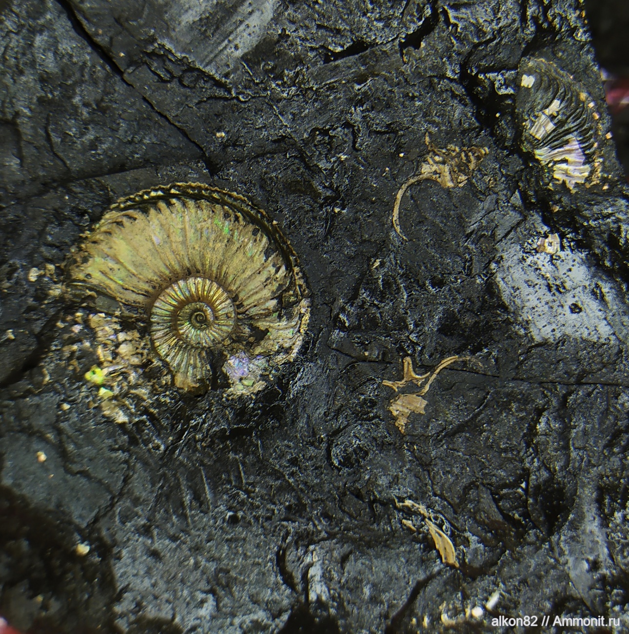 Нашёл сын, аммонит торчал спинкой не более 1см, взяли всю плитку в надежде на целого, но оказался не целым. Я только всё расчистил, многими пропитками пва плитка сохранилась, но из-за этого первозданный перламутр аммонита чуть был утерян, он как бы окислялся на пирите, образуя покрытие как "пудра-мука", чтобы его не сдуло, по сухой уже глине после всей стабилизации 3 раза покрыли его цапон лаком