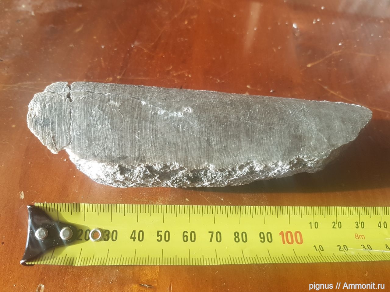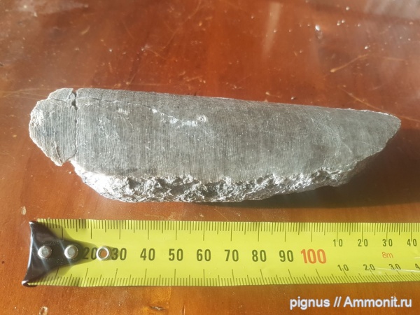 Кусок раковины прямораковинной наутилоидеи - ортоцериды. Точнее определить вряд ли получится. Хоть и не полный, но интересный образец - в левой части (примерно над цифрой 30) видны характерные изгибы ребер - это следы прижизненных повреждений раковины. | ||||||