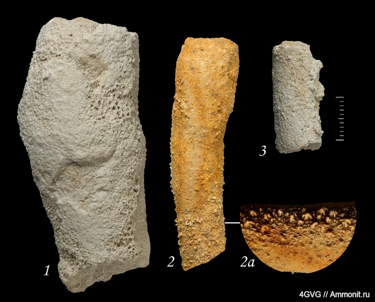 1 - карьер Пирочи, 2 - Домодедовский карьер (2а - поверхность губки крупным планом), 3 - карьер Старые Пески