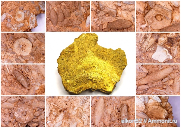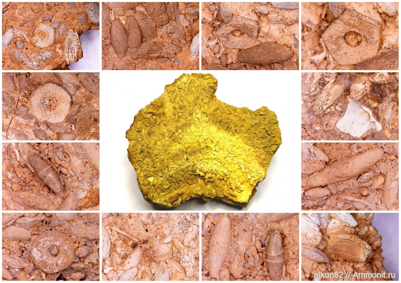 Множество фораминифер на одном кусочке, и немного члеников криноидей, и небольшая брахиопода.