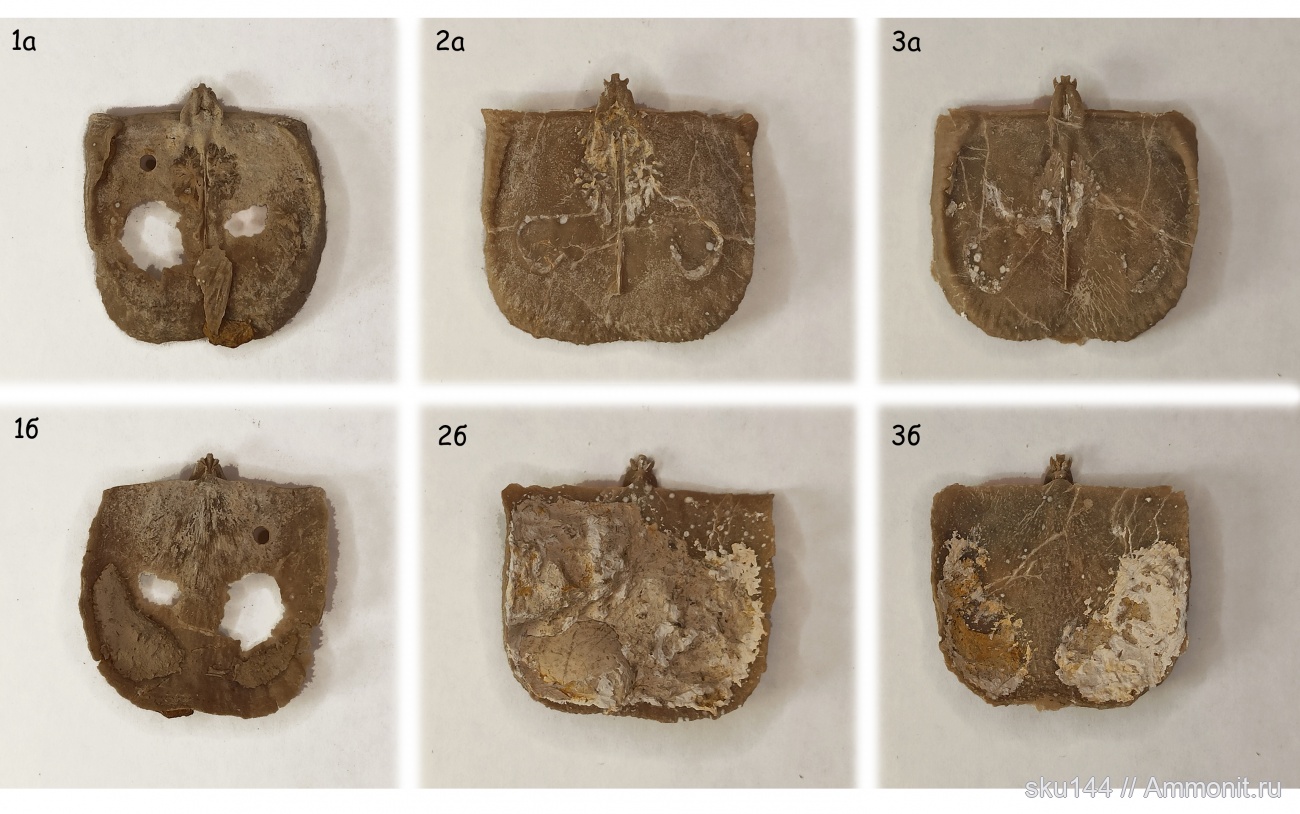 Редкие находки целых спинных створок продуктид с сохранившимся замочным отростком. Под буквами "а" - внутренняя сторона, "б" - внешняя. На внутренней стороне видны следы прикрепления мускулов. Препарация естественная - как дед завещал, никакой химии. Размеры - как раз впритык в спичечный коробок влезают.