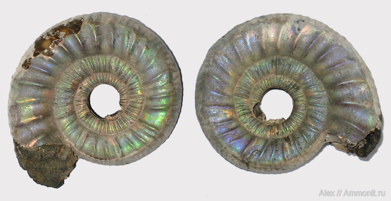 Аммонит Binatisphinctes, скорее всего Binatisphinctes pseudomosquensis. Встречается значительно реже других бинатисфинктесов - Binatisphinctes mosquensis и Binatisphinctes rjasanensis. Цвет перламутра у него действительно такой, как на фото, одна сторона зеленоватая, другая синеватая.