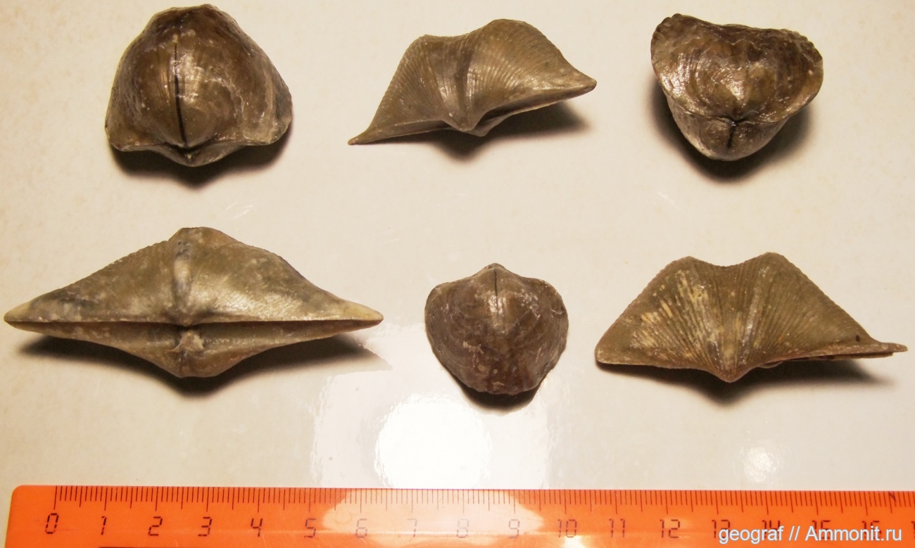 "Ушастые" Cyrtospirifer rudkinensis, "пузатые" Tomestenoporhynchus rudkini. | ||||||