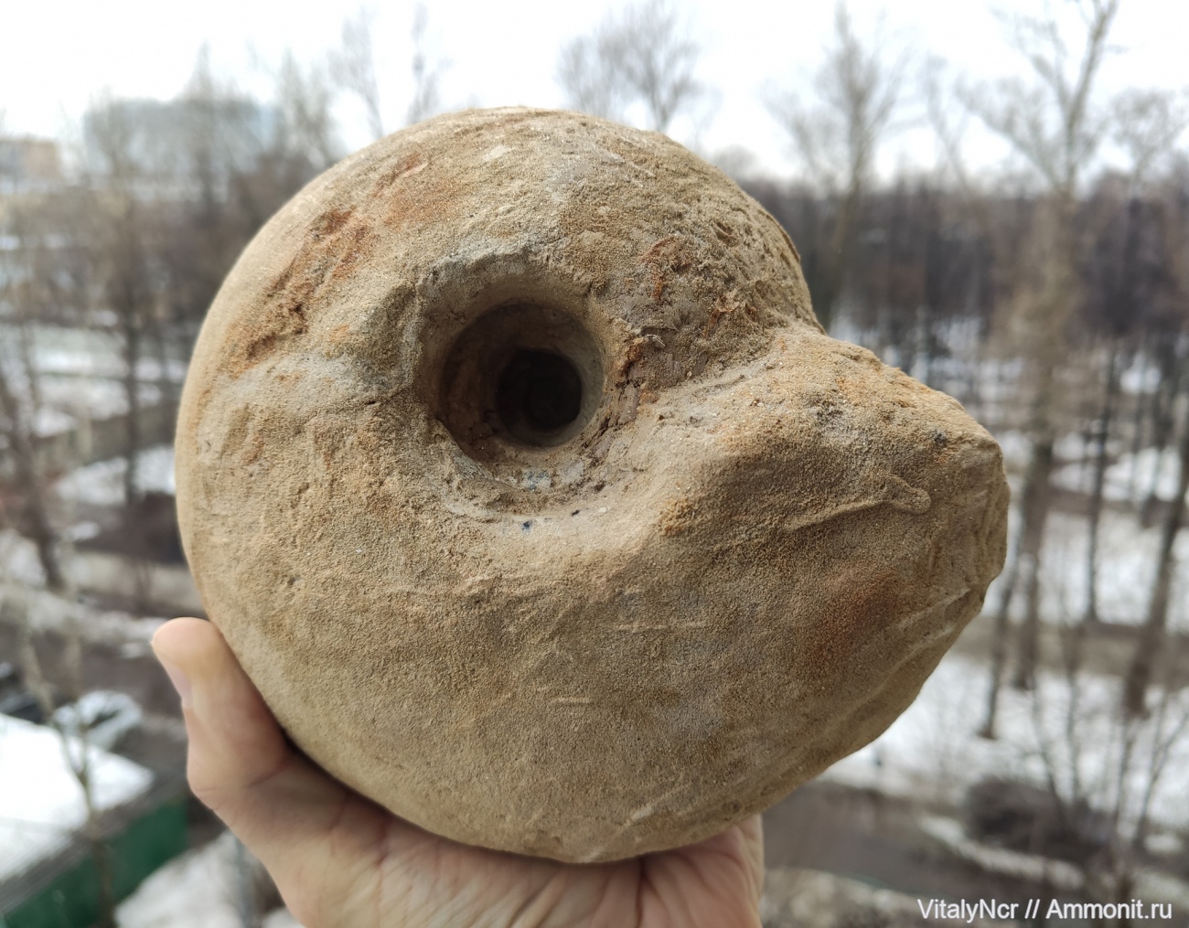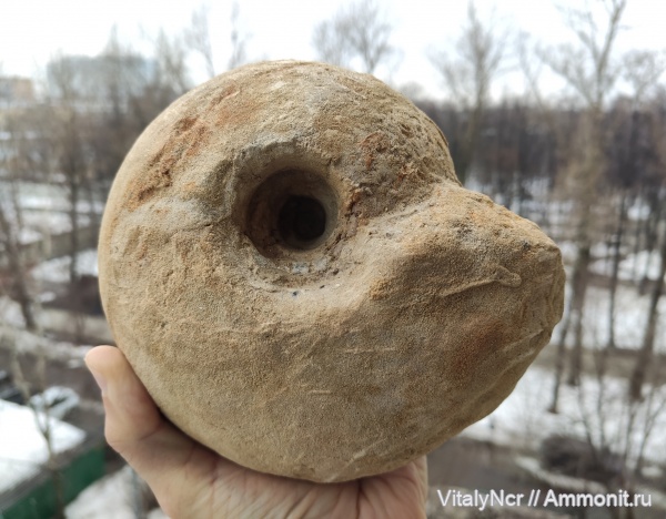 Забавной сохранности Rondiceras sokolovi я привёз в прошлом году из оврага у села Илешево на Верхней Унже. Он представляет собой ядро из слежавшегося песка - ЖК поплотнее, фрагмокон порыхлее. Фактически держит его вместе лишь пропитка из разбавленного ПВА. "Заглушки" из фосфоритовой конкреции в пупках я вывернул, как шурупы.