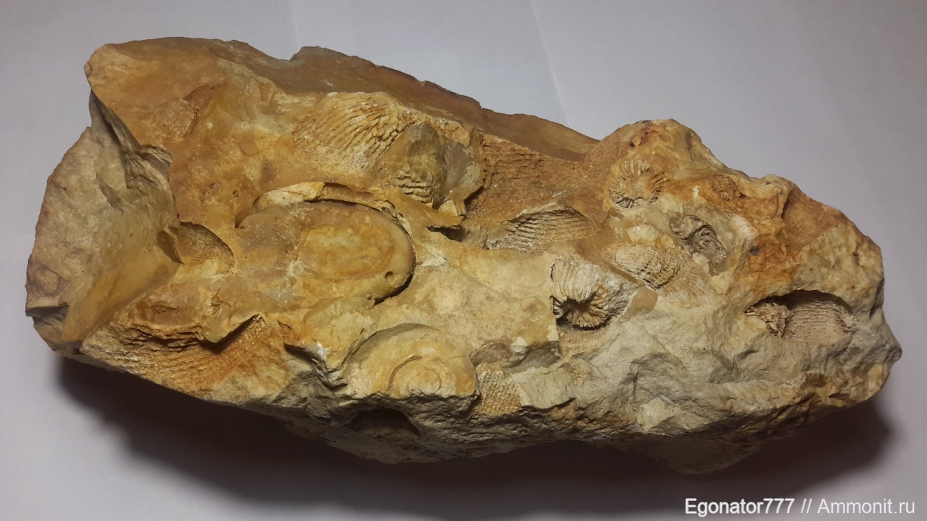 Симпатичная находка. Ядро и отпечаток улитки вроде как Euomphalus. А вот насчет кораллов сложнее, там ведь различия между родами на уровне тонких деталей строения. А здесь всё фрагментировано, частично скрыто вмещающей породой, обработано всякой коррозией-эрозией и неведомо какими еще процессами. Я не уверен, что даже специалисты дадут точные названия. | ||||||