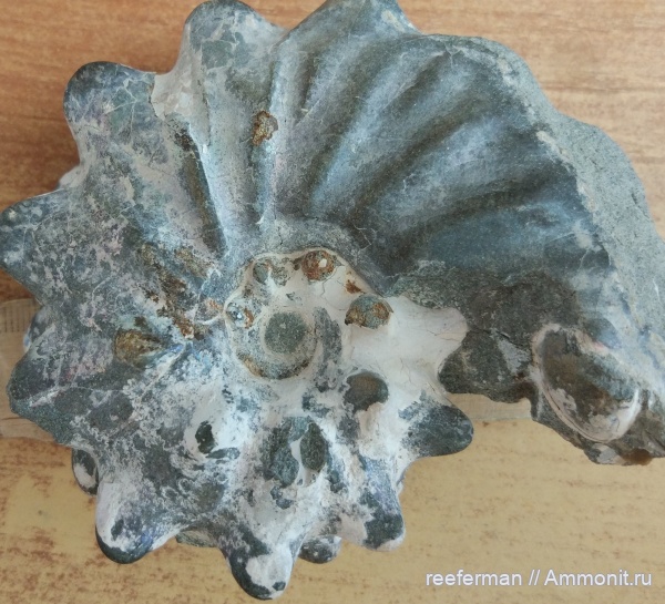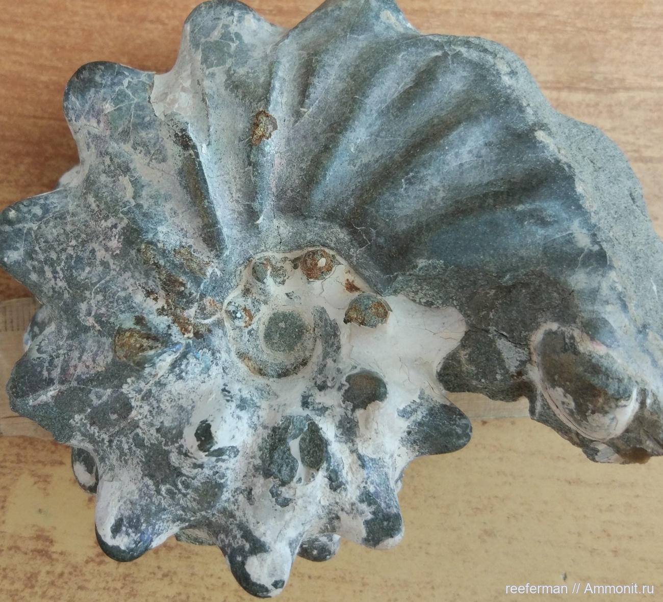 Так сразу в соседнем фото Непонятный аммонит определили, что Protohoplites, или что-то близкое. Вот почему я категорически против размазывания одного образца по нескольким фотографиям. | ||||||