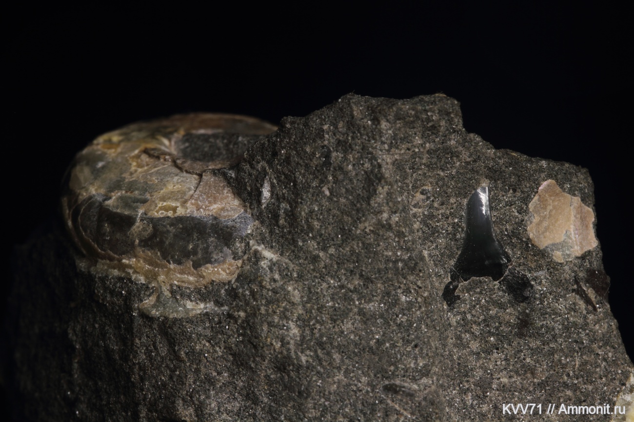 Такой попался при разборке верхнеаптской конкреции с аммонитами. У нас в крае и в республике Адыгея очень редкая находка. До сих пор встречались зубы только в Мостовском районе. И этот оттуда.