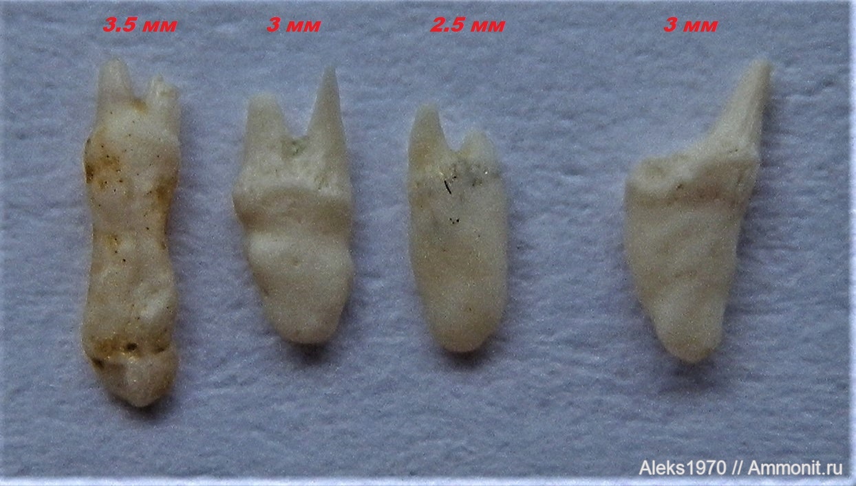 Промыл глину, среди мелких останков рыб выскочили такие зубки. И сразу вопрос, может кто знает чьих они будут? Есть моё предположение, что зубы эти из тех что шли по краю челюсти вот из этих. Хотя есть сомнения, тут видно что они парные и вставные, а на этом фото они не имеют "корней"