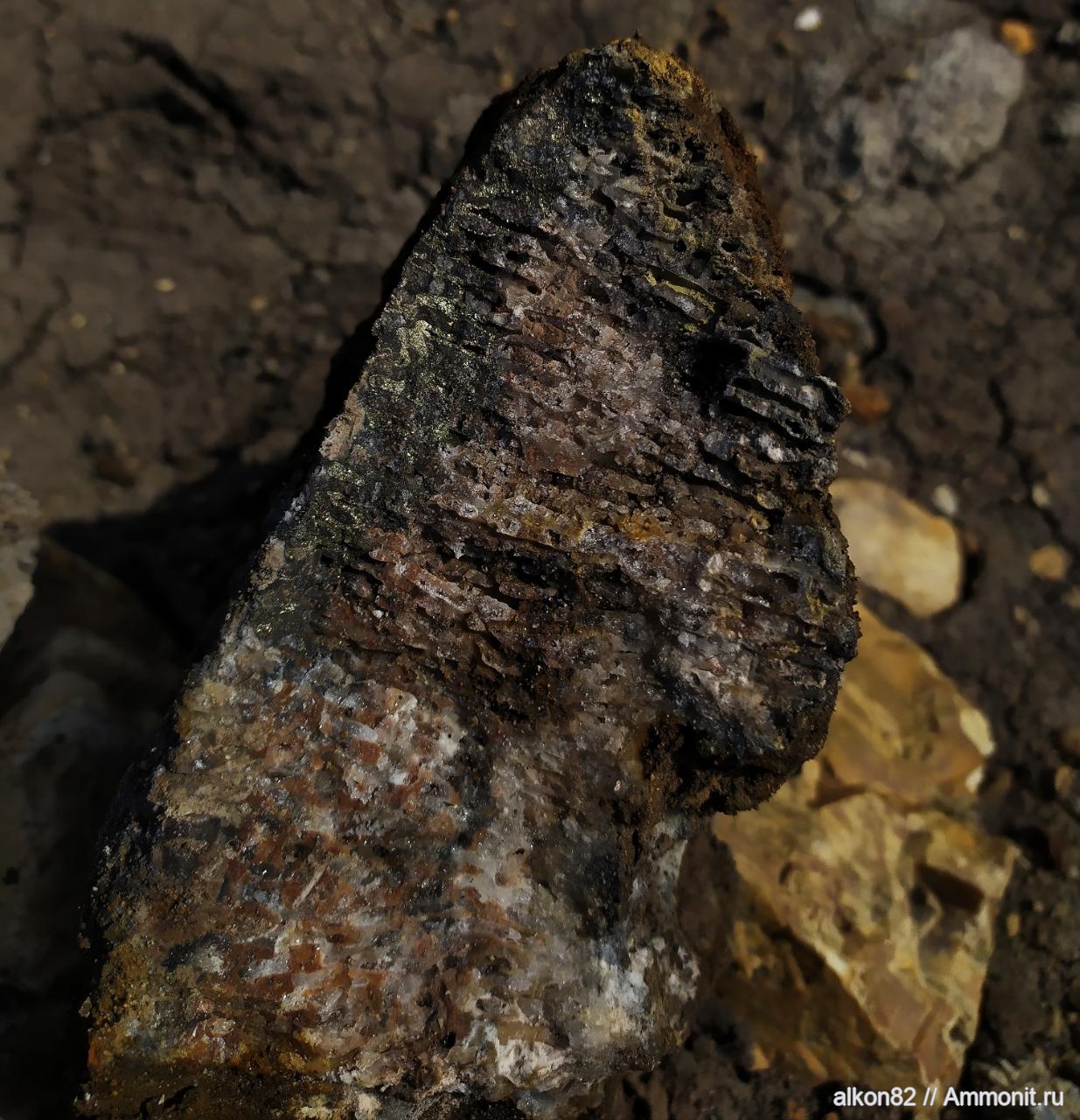 Ну не кварцит, а кварц (кремнезём) скорее всего. Пирит здесь поздней генерации. Хорошо видно, что он не заходит в глубокие слои, а только там где был контакт с юрской глиной. Сама колония имеет отрицательное замещение, то есть трубочки полипняка растворились и от них осталась сеть канальцев.