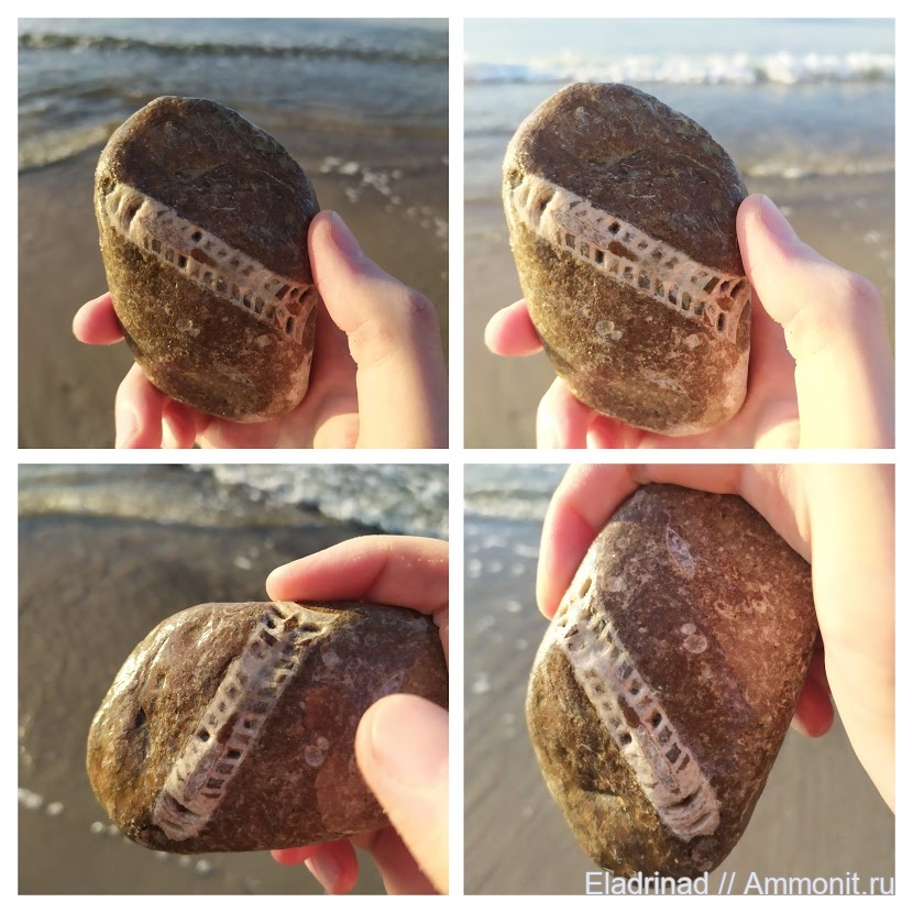 Интересный срез прямораковинного головоногого (предположительно ортоцераса), найденный вблизи польского курортного города Ustka на пляже Orzechowo.