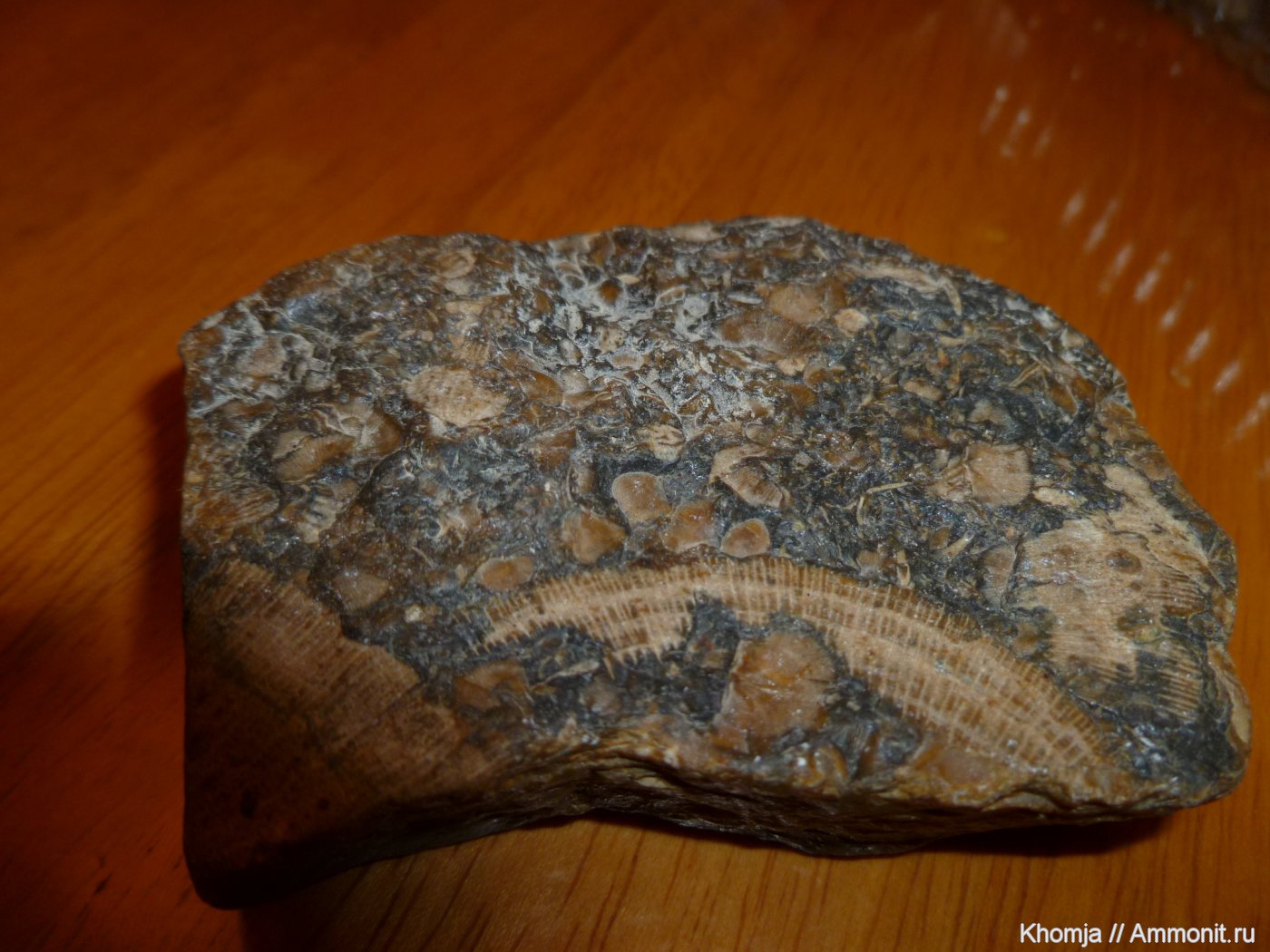 В камне явно просматривается какая-то палеофауна, но сфотографирован он не очень удачно и нет никакой информации о месте находки, что осложняет определение. | ||||||