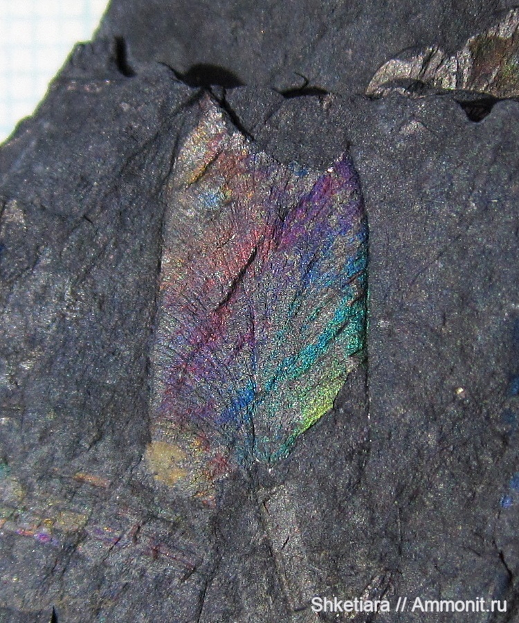 Кажется, побежалость вместила всю радугу в маленький и ничем до этого не примечательный листик. Явление не связано с прижизненной окраской. Это интерференция света в тонкой минеральной пленке на поверхности породы.