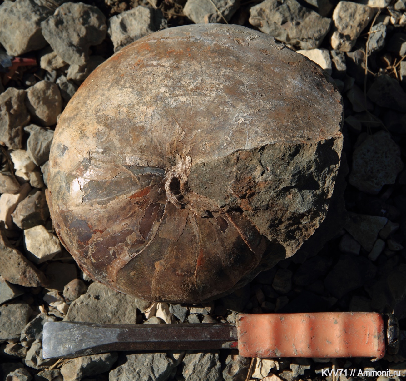 Наутилус находился с боку конкреции, торчал наружу только кусок жилой камеры Фото, Фото. Это обещало хорошую сохранность образца. До машины было не далеко, потому принято решение забрать конкрецию целиком и выпилить раковину болгаркой дома, часто при выбивании наутилус распадается по камерам либо получает повреждения как раз в местах их соединения Фото. Раковина осталась, как обычно на конкреции. На ней видны широкие ребра, не уж то ли редкий Anglonautilus? Вид с вентра, не такой широкий Фото.
