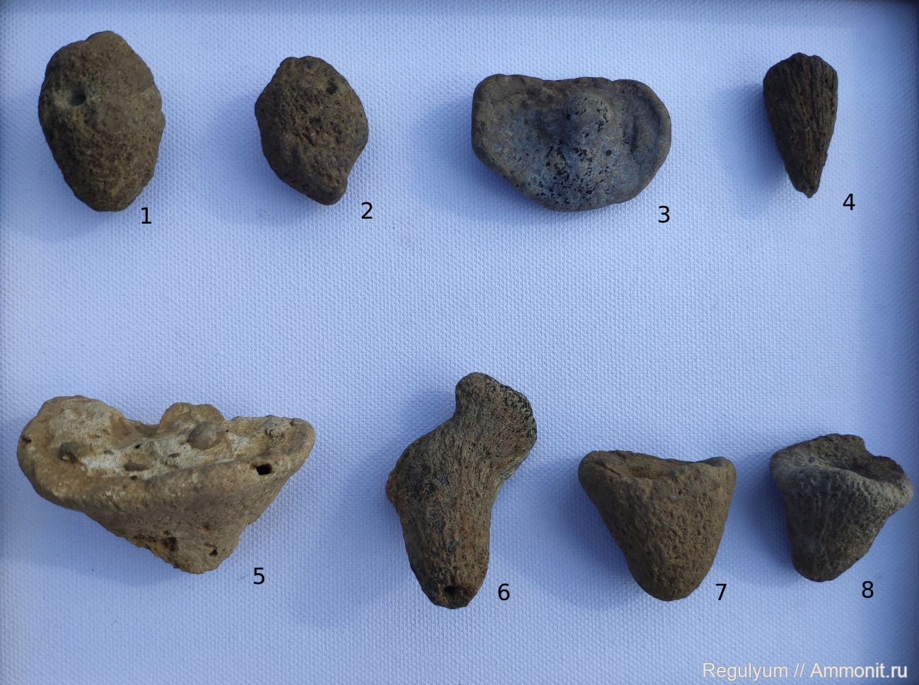 Помогите определит губки. Найдено в 2021 году в песчаном карьере Брянской области. Наиболее интересуют образцы под номерами 1,2,3,5. Очень интересно. =) Слой где были сделана находки принадлежит к верхнему мелу.