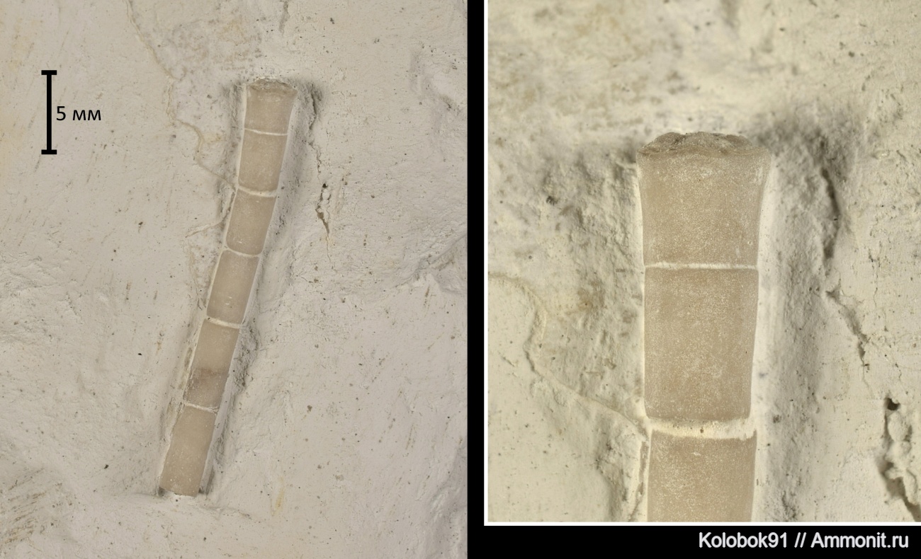 Стебель морской лилии Bourgueticrinus sp. с проксимальной частью чашечки.