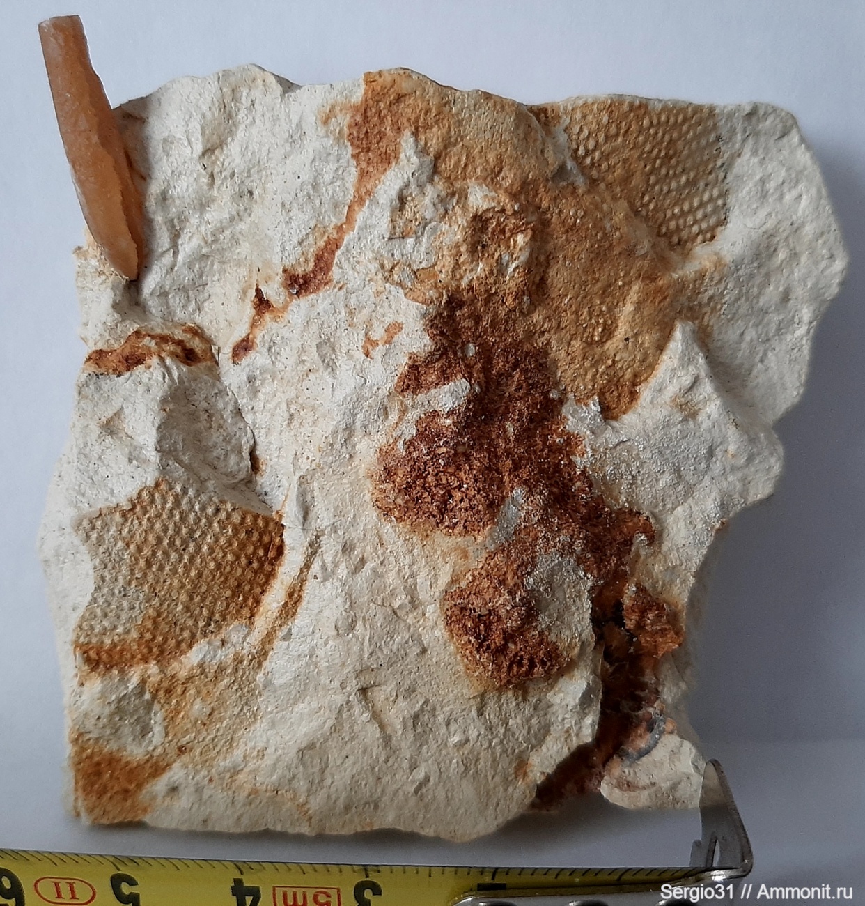 Вот такой отпечаток на породе был найден в меловом карьере . Похоже на отпечаток мшанки . Могу ошибаться. В верхнем углу присоседился белемнит . Помогите с определением .