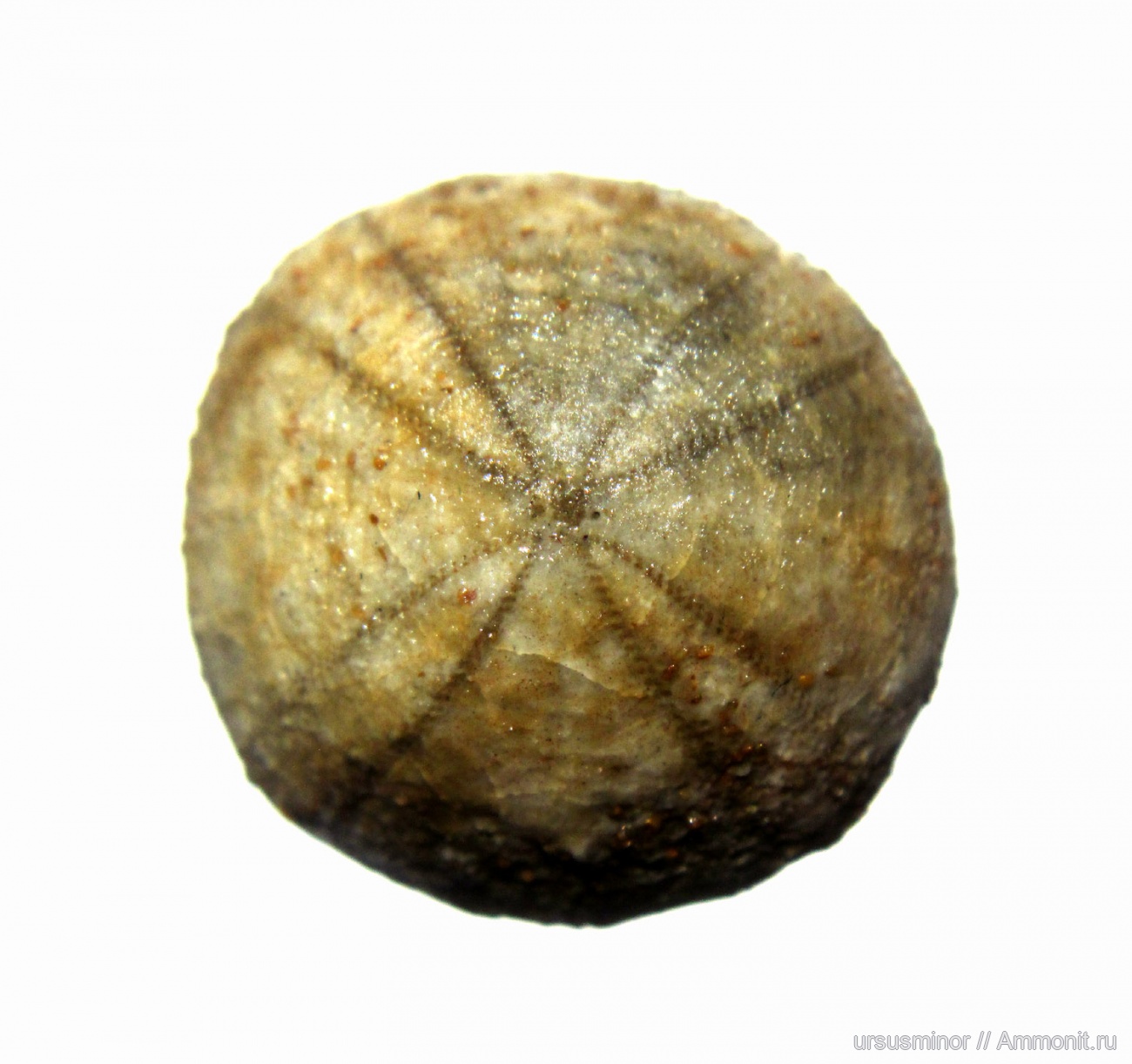 Дополнительное фото (с других сторон не снимал, т. к. низ забит породой, и другие ракурсы были бы неинформативны). На обоих фото ёж повёрнут передом вверх. Диаметр ежа 14 мм.