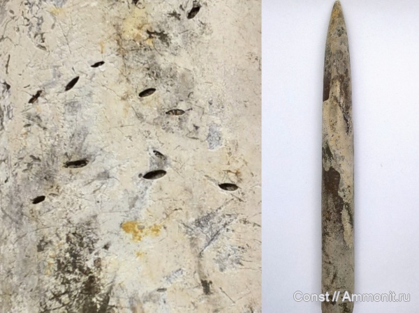 Покрыт по всей длине углублениями размером 1 мм. Длина ростра 18 см. Предполагаю, что это начальная стадия действия сверлильщиков.
