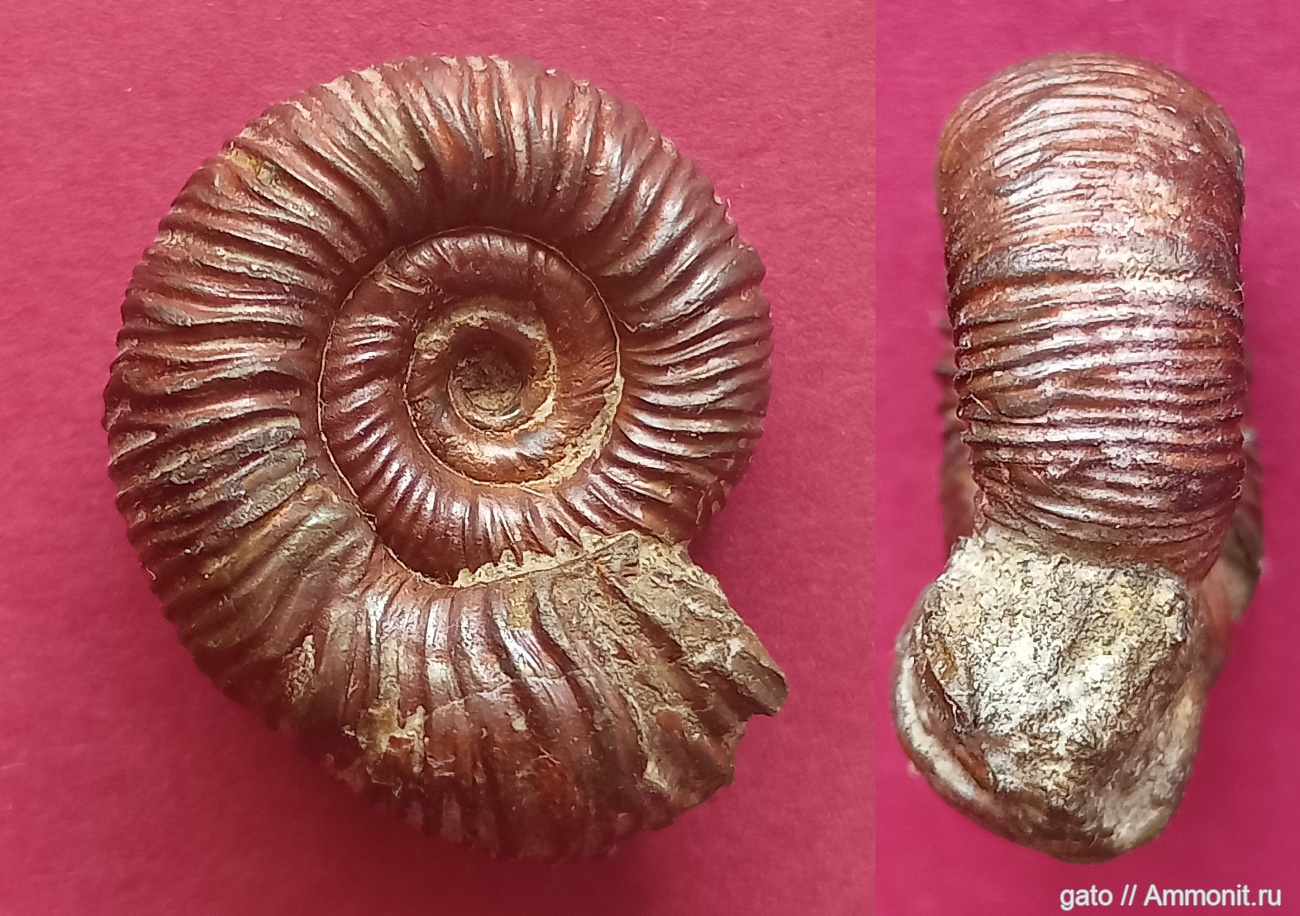 Обороты средней толщины, ребра извилистые, присутствуют многочисленные "плечики" (parabolae) (см. фото, подобное на них ранее отмечал Д.Буев). Есть какая-то аномалия ребер, некоторые начинаются справа, а слева исчезают. Диаметр 2 см, пирит