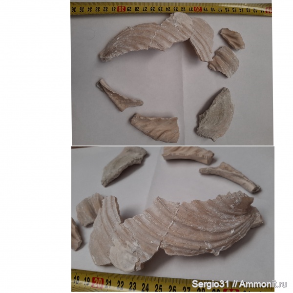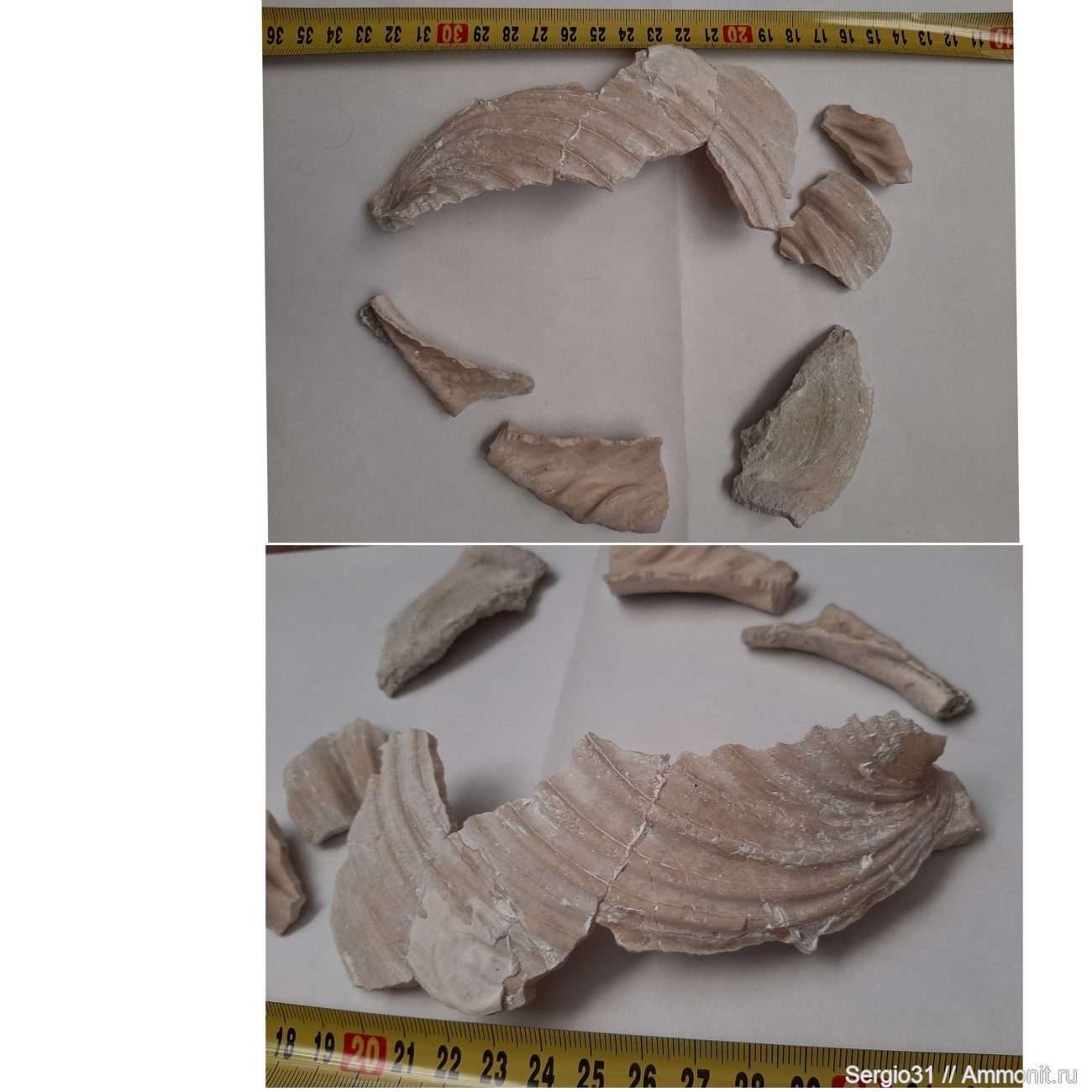 Находка была сделана в карстовой воронке в пригороде гор. Старого Оскола . Из почти отвесной стены мела торчало множество обломков моллюсков разной фракции. На фото самые крупные