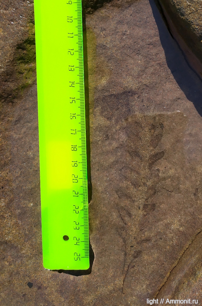Взять образец в руки, чтобы хорошенько сфотографировать, не представлялось возможным: он находится в огромной плите в полосе прибоя. Чтобы сделать фото, пришлось дождаться отлива и снимать пока одна волна откатилась, а следующая не нахлынула. Линейку пару раз уносило водой. :)