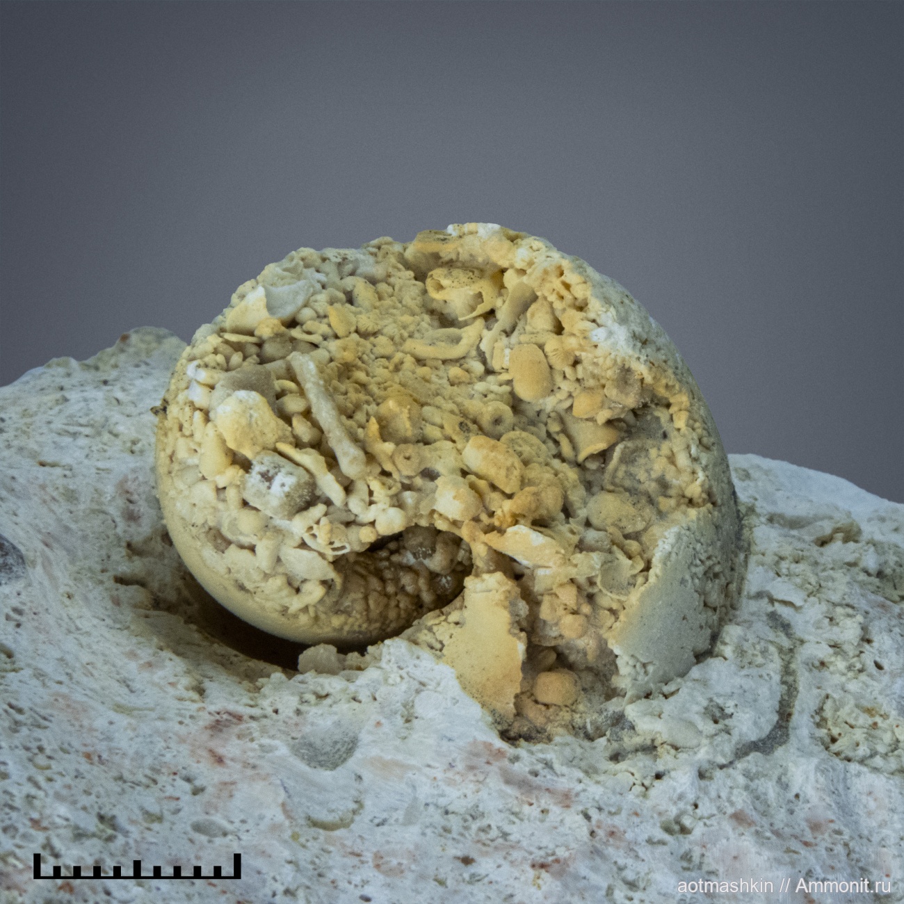 Хороший образец! Наглядный пример постседиментации (эпигенеза породы): часть осадка (ядра) с детритом в полости моллюска была растворена вместе с раковиной.