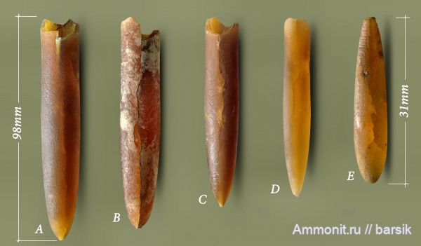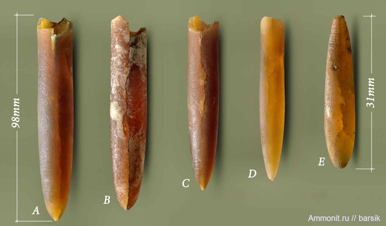 На фото представлена выборка находок верхнемеловых ростров севера Ростовской области. Размер самого крупного «А» -98мм, самый мелкий «Е» дан вне масштаба, его длинна – 31мм. Но это всего лишь видимый размер, полная длинна этих ростров при жизни могла быть в 2-3 раза больше. К сожалению, передняя часть имеет не такое массивное строение, а содержит более хрупкие и объемные детали, которые сохраняются очень редко.