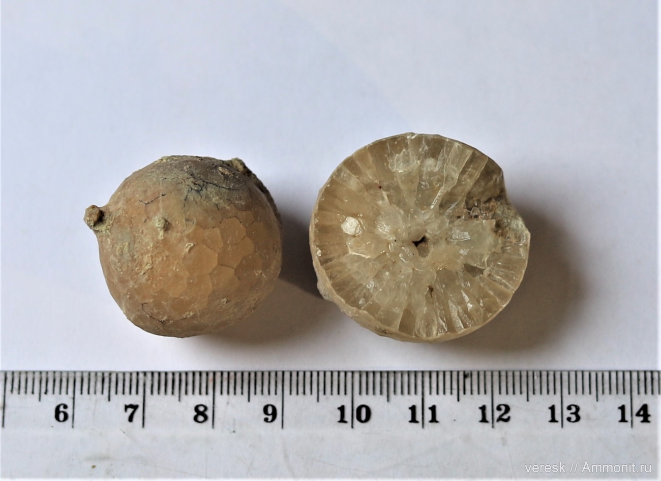 Пузыри хорошо очищаются обычным канцелярским ножом. Кальцитовые смотрятся очень эффектно, особенно на солнце. Но для изучения абсолютно бесполезны: кристаллизация уничтожает морфологические признаки, в первую очередь ромбопоры. | ||||||