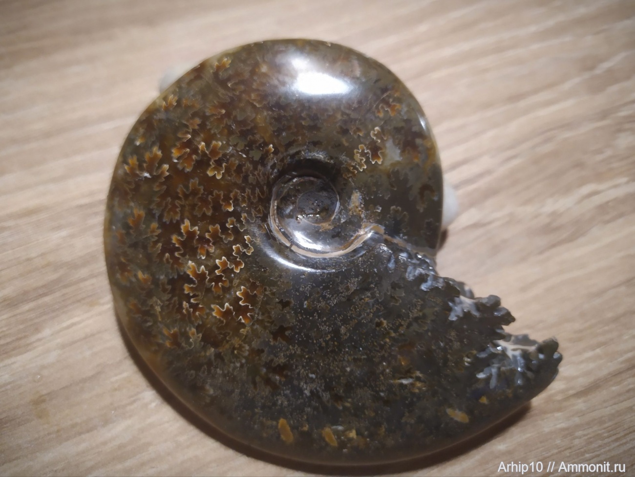 Вид и возраст продавцы должны были сказать, мы же эти аммониты не добываем (вспомнился анекдот). Аммонит по виду отполирован так, чтобы видны были перегородки фрагмакона (экспортироваться по местным законам может только серьезно обработанный, полированный или обрезанный аммонит). Никаким аммонием он вроде не покрыт, это полированное кальцитовое ядро. | ||||||