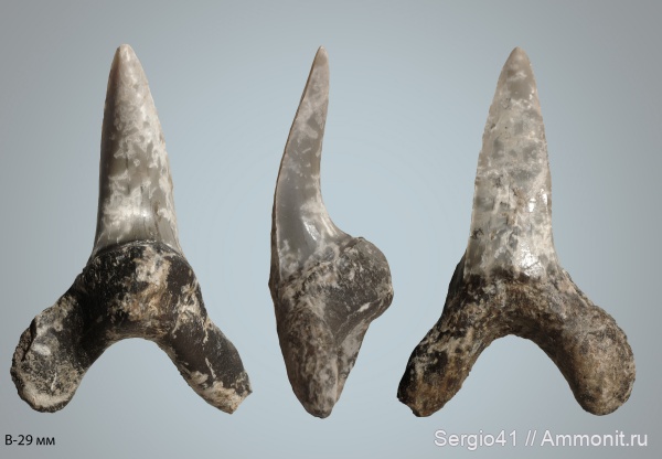 Зуб был в конкреции, когда я его доставал. И у него был остренький латеральный зубчик с одной стороны. Ну он и остался в породе :-)