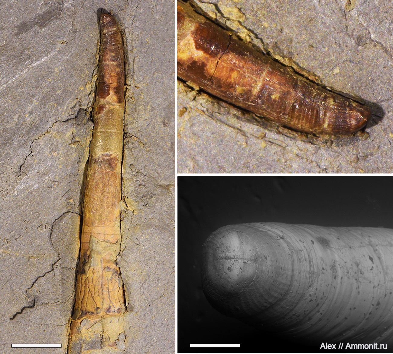 В стешевских глинах Борщевского карьера часто встречаются пиритизированные (и лимонитизированные) прямораковинные наутилоидеи. Обычно эти находки представляют собой ядра, в то время как сами раковины сохраняются редко и фрагментарно. Особенно сложно найти начальные части прямых раковин - чаще всего они растворены и никакой структуры поверхности у них не сохраняется. Однако, недавно мне попался образец совершенно уникальной для этих мест сохранности - с лимонитизированной эмбриональной раковиной. Он небольшой (на фото слева масштабный отрезок - 3 мм) и его начальную часть удалось хорошо заснять только используя сканирующий электронный микроскоп (фото справа внизу, масштабный отрезок 0.5 мм). На основании раковины хорошо виден рубчик-Cicatrix. Это первая находка эмбриональной раковины и цикатрикса из нашего нижнего карбона, о которой мне известно. Присутствие цикатрикса говорит о том, что эта наутилоидея относится к отряду Pseudorthocerida (у Orthocerida цикатрикса не было, а у Actinocerida он был, но они имели совершенно другое строение сифона). Возможно, что это Dolorthoceras, хотя определение нуждается в проверке и уточнении.