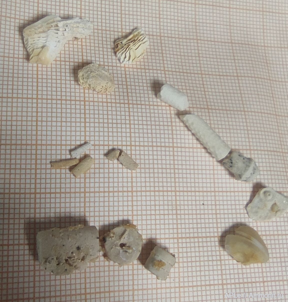 Средний - слева кусочки мшанок, справа - обломки игл и таблички морского ежа.
