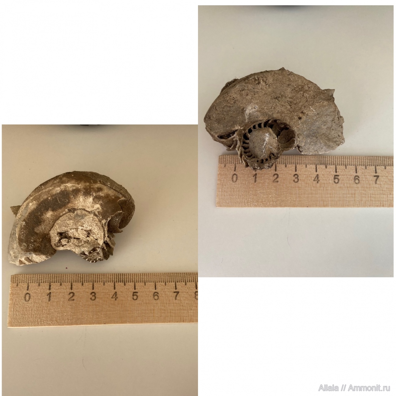Я думаю, что это не аммонит, а наутилида. Точно определить сложно, но и форма раковины и перегородки наутилусовые. | ||||||