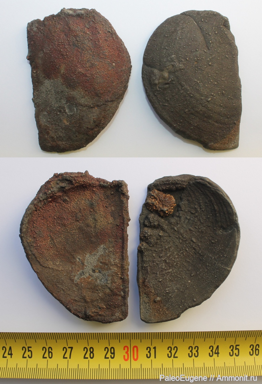 Два аптиха Laevaptychus от аммонитов аспидоцератин. Верхнекимеридский ярус, биогоризонт S. aff. rebholzi. Полностью пиритизированны. Размер примерно одинаковый - 49*69 мм. Проведена парафинизация, но не знаю насколько это актуально для аптихов, пузырьков почти не было. За определение благодарю Юрия и Михаила тут .
