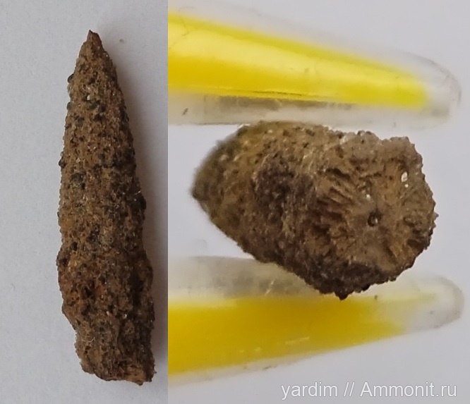 Спасибо, но, если честно, совсем не похож. У меня полно белемнитов оттуда самого разного размера. Форма та же, но поверхность явно покрыта темными пупырышками. И канал внутри должен быть гораздо шире, а стенки тоньше. На другом форуме предположили, что это одиночный коралл, а радиальные пластинки на изломе - это септы. Но форма совсем не та. Даже не знаю, что и думать... | ||||||