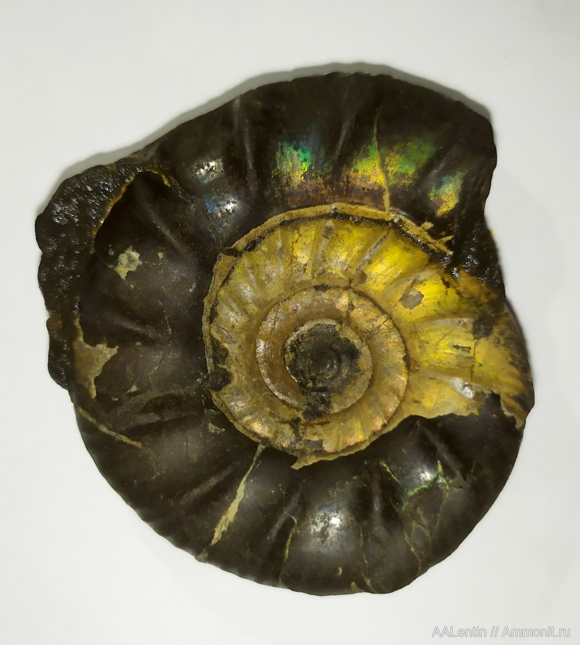 Аммонит немного смочен водой, чтобы отчётливо было видно красоту.