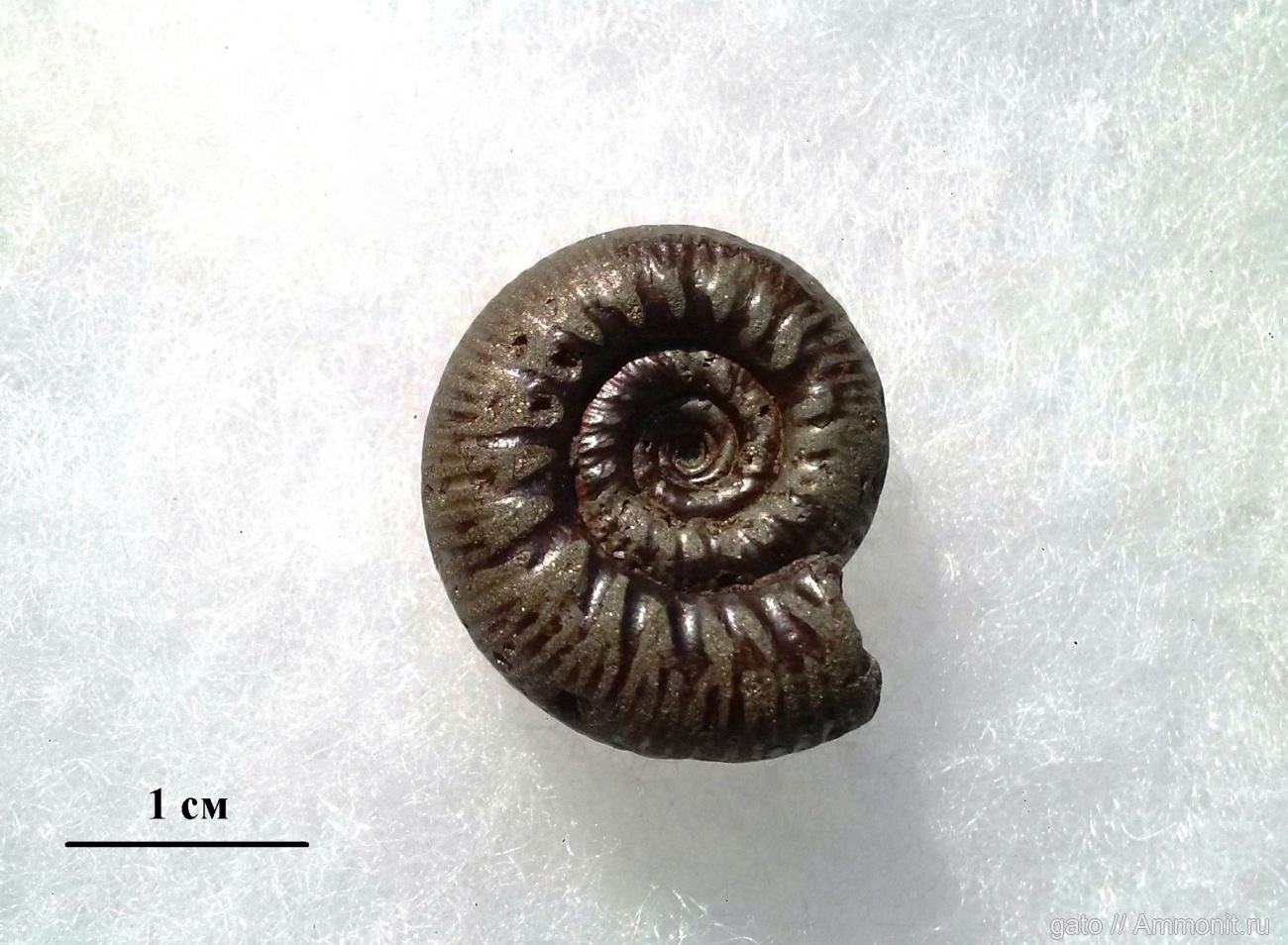 Определение по той же работе. Исходил из того, что именно этот аммонит больше похож на peregrinus как более плоский и эволютный, и не имеет такого нарастания оборотов. Но, может, я не прав, и они оба peregrinus'ы. Фото при находке. Пирит