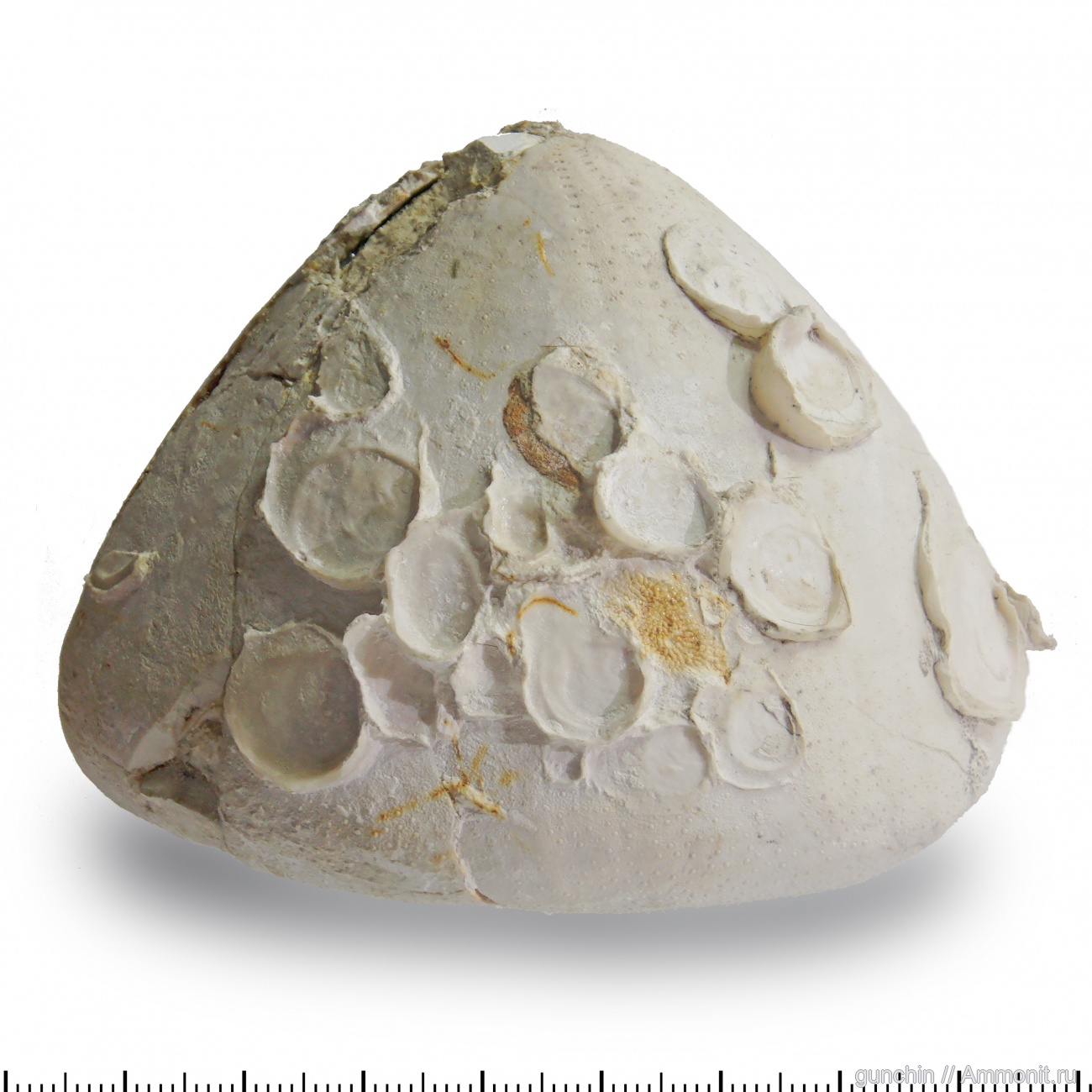 Морской ёж Echinocorys с обрастателями (двустворки и мшанки Rosacilla). На сайте нашел только одного ежа с похожими двустворками: морской еж Echinocorys с обрастателями.