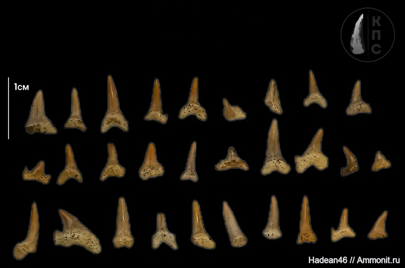 Эти зубы принадлежат разным акулам Мелового периода Рязанской области. Представители родов Eostriatolamia, Archaeolamna и Synechodus.