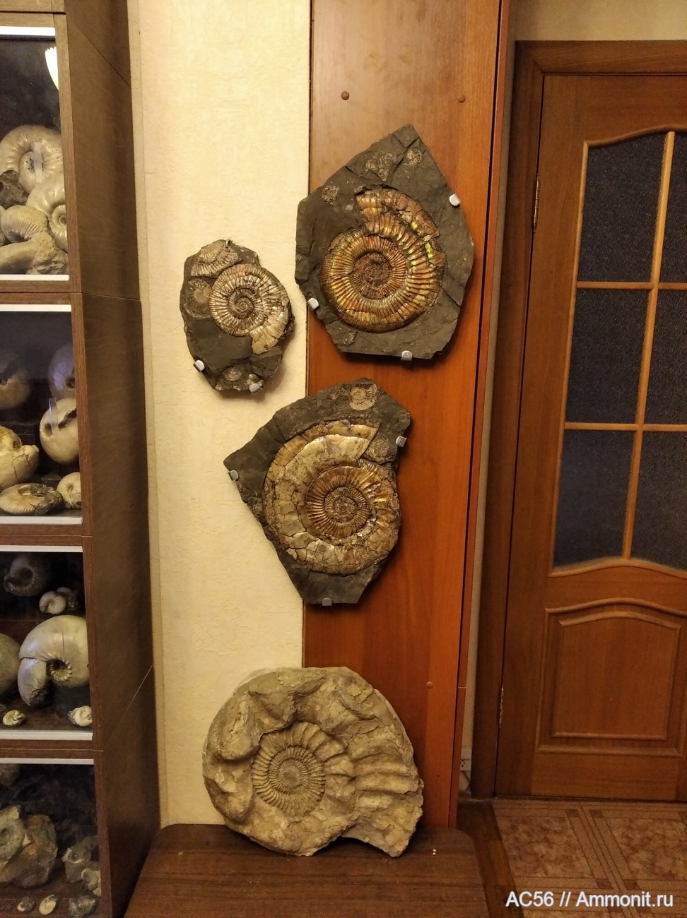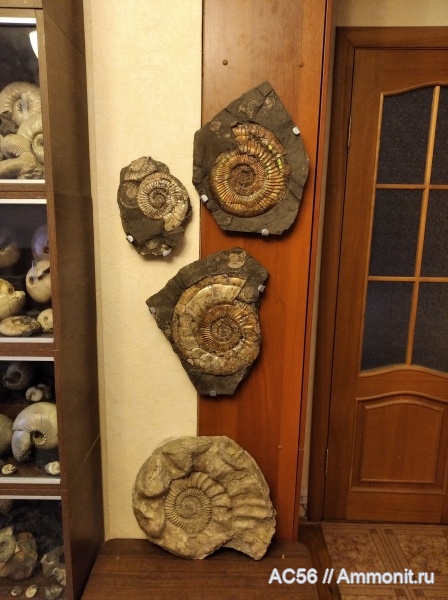 Решил хоть как-то использовать хранящийся пудами материал. Разместил на стене четыре разных вида перисфинктесов из Михаленинского оксфорда. Остальные 5-6 видов просто не влезли в композицию. Получаю визуальное удовольствие :)