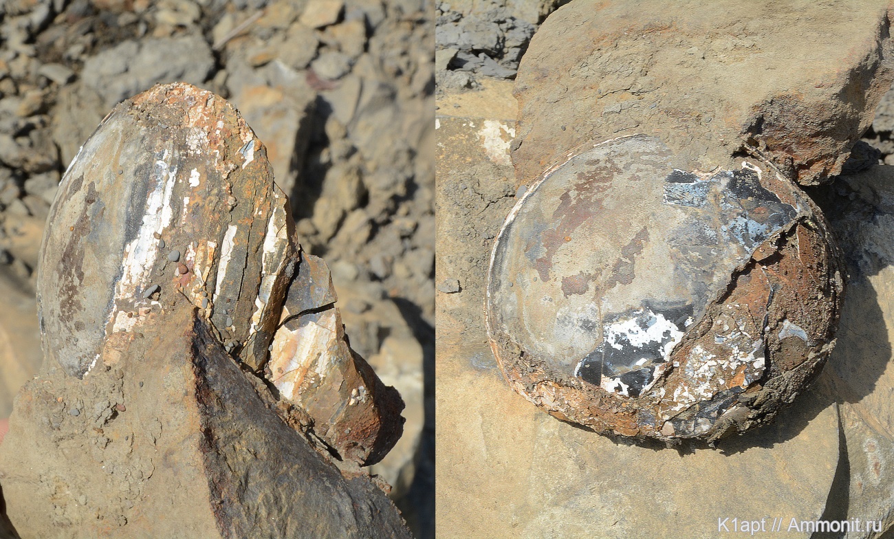 Прекрасная иллюстрация того как сильно решает подача материала. Когда сам лично взял его в руки аж ахнул от удивления. Тут же по фото ничего не понятно, мало того что еще частично в конкреции, частично разобран, да еще и без привязки в размерам и т.д. Думаю что образец требует повторной публикации после препарации и склейки. | ||||||