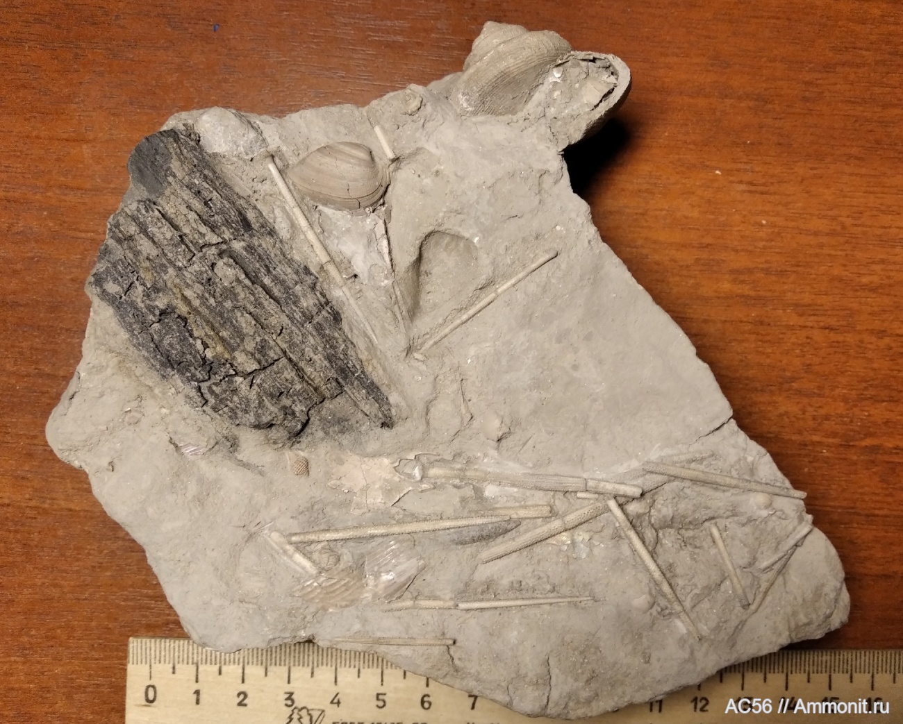 В Михаленино в глинах среднего оксфорда довольно часто встречаются скопления игл морских ежей. На этом образце ещё присутствуют: Bathrotomaria muensteri, Grammatodon pictum, Astandes keyserlingianus и кусочек древесины. Подзона tenuiserratum