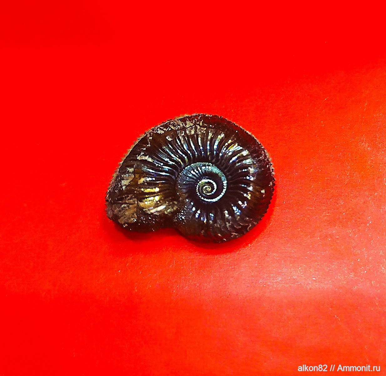 Одна сторона аммонита сине-металлического блеска, скорее всего, из-за замещения халькоперитом. Вторая сторона "ярко-золотая"