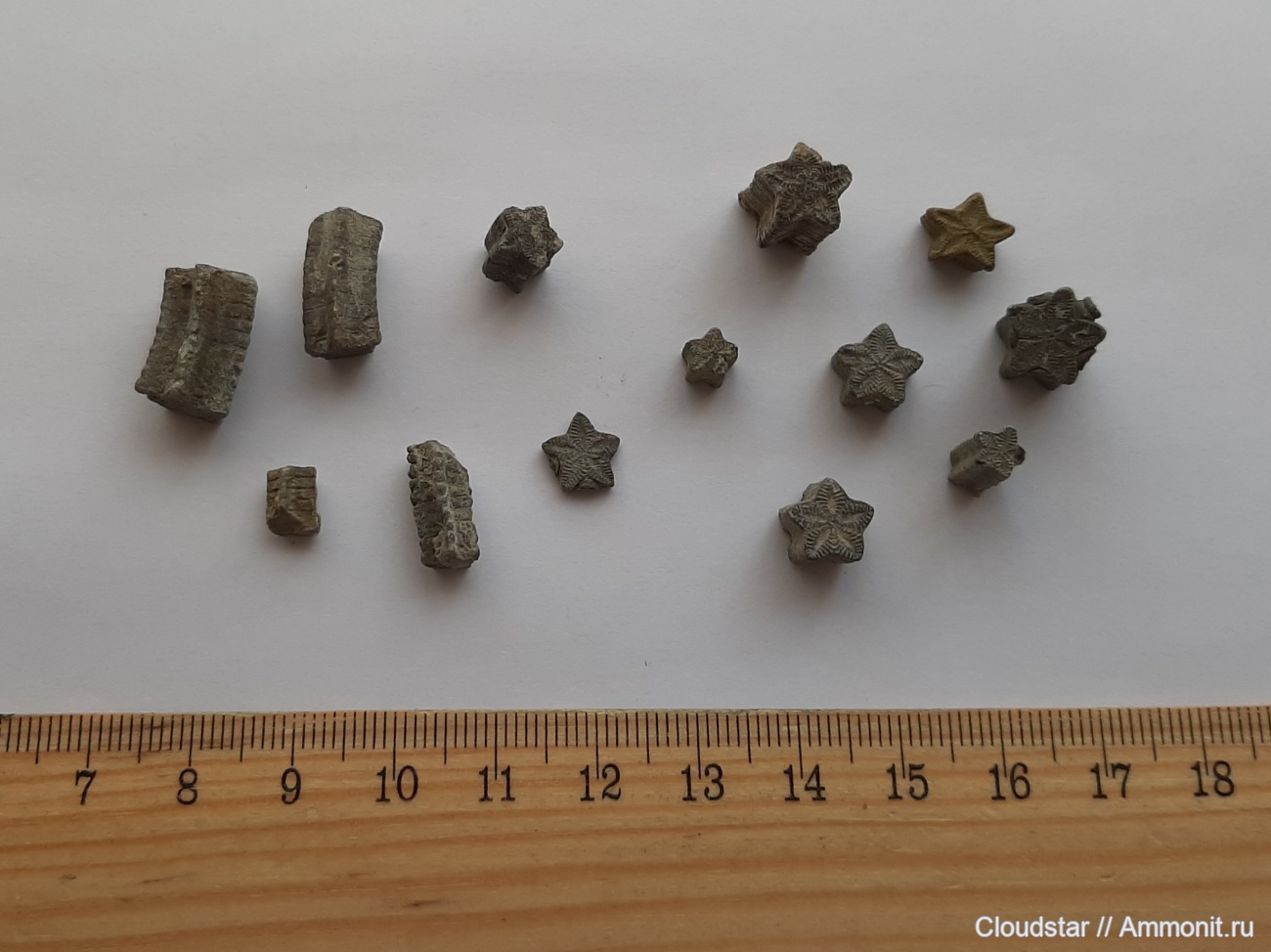 Мастер, посмотрите вот это: Ископаемые морские лилии пентакриниды. Не обязательно читать от начала и до конца, постарайтесь просто оценить "масштаб бедствия" и выделить ключевые особенности, имеющие отношение к вашим находкам. | ||||||