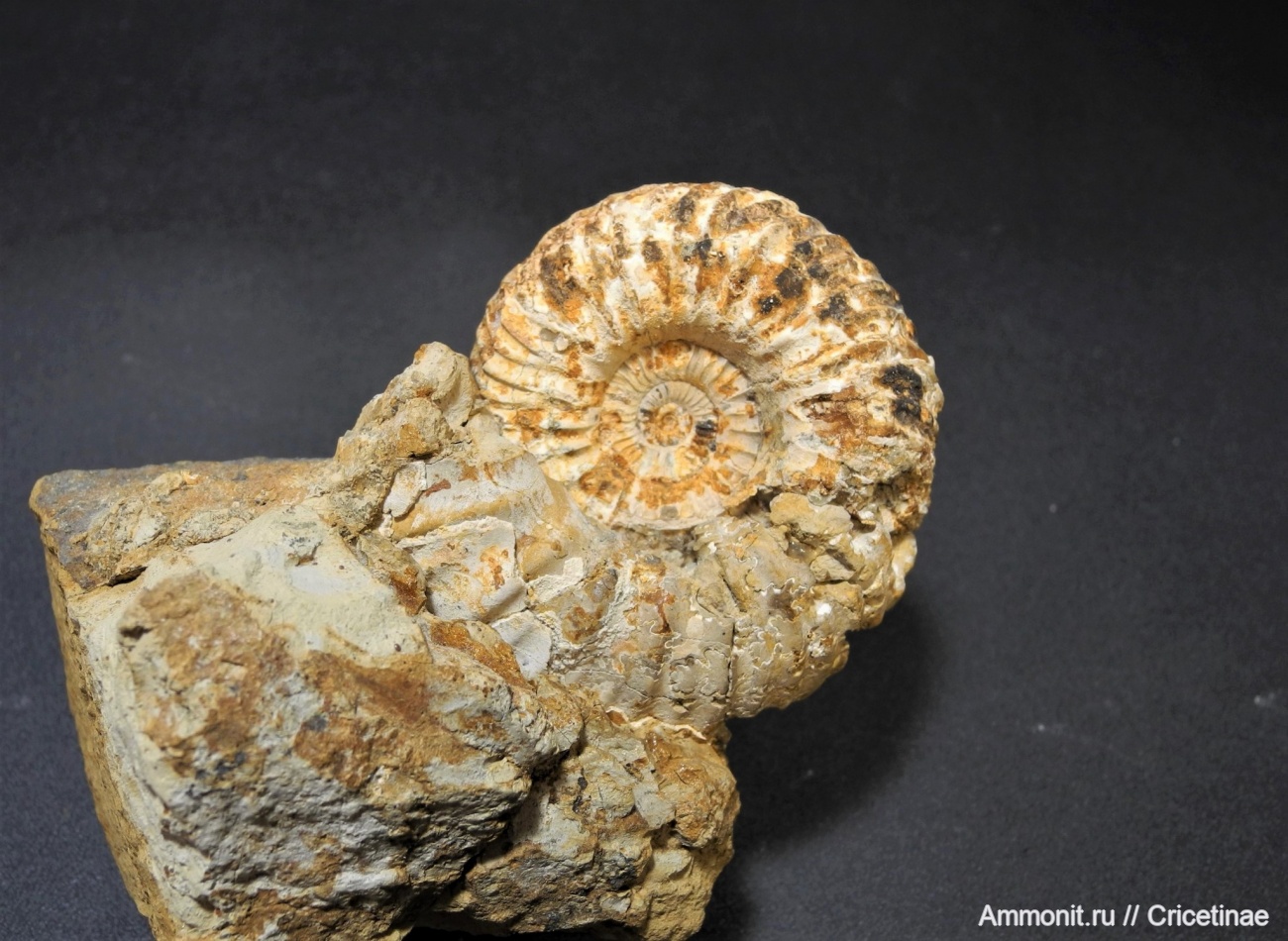 Размер аммонита 7 см. Аммонит найден в зоне ламберти. Немного смущает правда широкая и ребристая ЖК как у Longaeviceras, но у последнего узкий пупок, не такой как у этого. Тут фото с обратной стороны. А тут фото с вентра