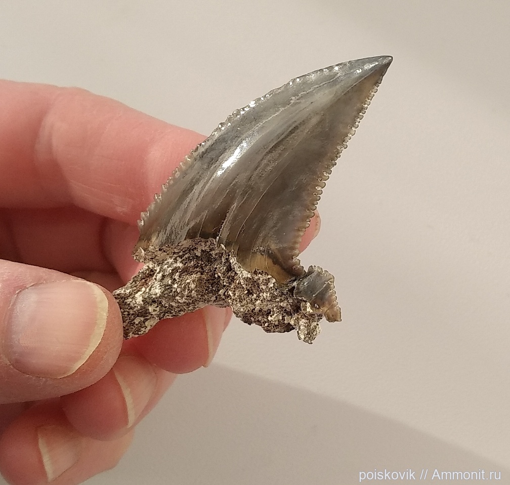 Относительно крупный зуб акулы (размеры: 34мм Х 35мм). Найден в блоке нуммулитового известняка Юго-Восточного карьера у с. Пролом (Крым).