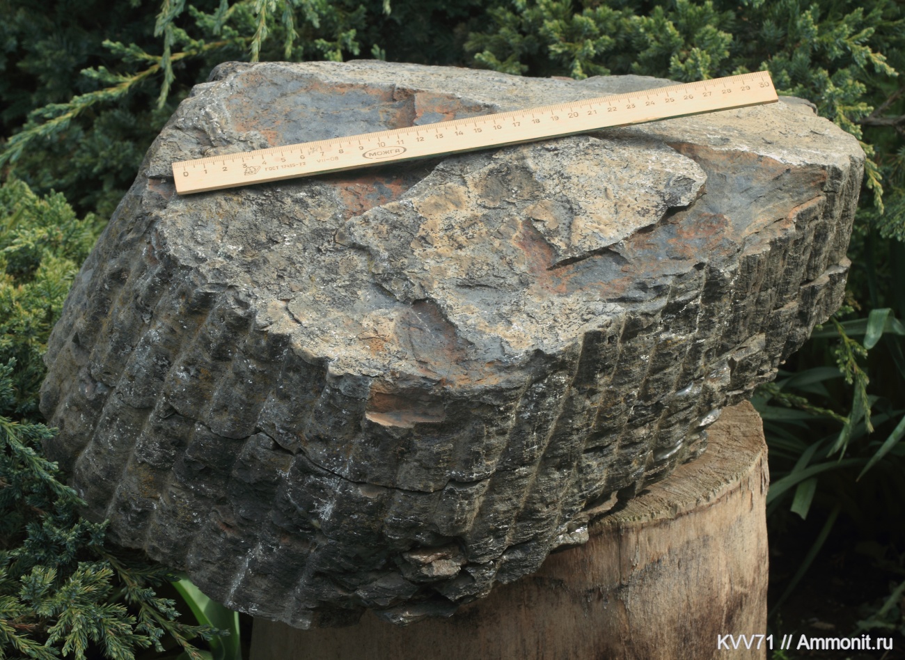Попался ствол диаметром более 40 см, немного деформирован. Хорошего сохрана, но долго лежал под Солнцем и дождем. При находке трещины уже были, но был еще монолит, после транспортировке около 400 км трещины расширились и ствол при подьеме стал хрустеть в руках. Вес большой, сам себя раздавил на кочках. Разобрал, что можно, клеял. Четко видно, что это сигиллярия, есть ребра и листовые рубцы. Навряд ли пережил бы еще одну зимовку на терриконе.
