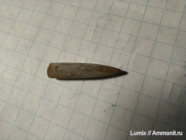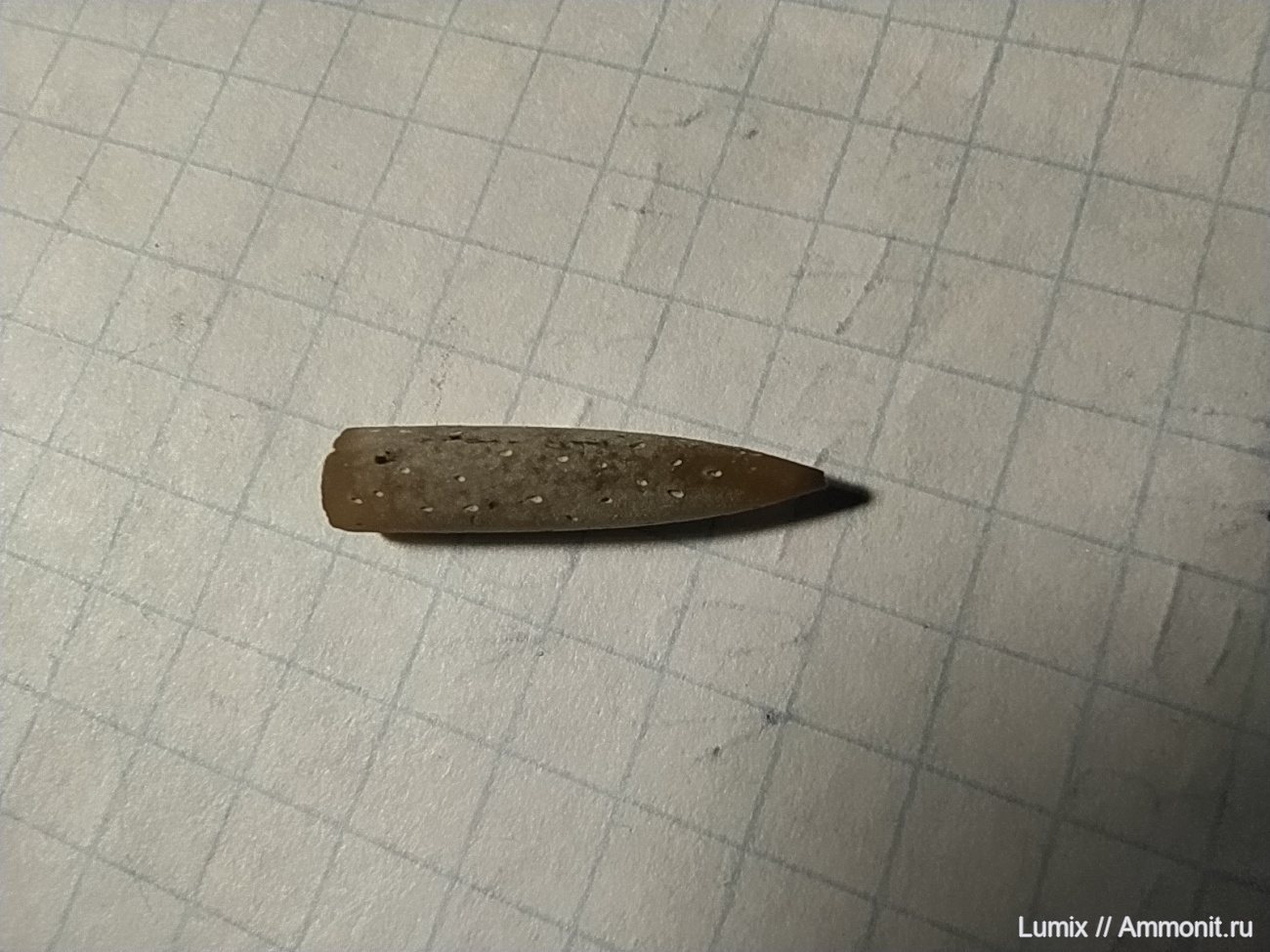 Его сверлили усоногие рачки, типичные посмертные следы на белемнитах. | ||||||